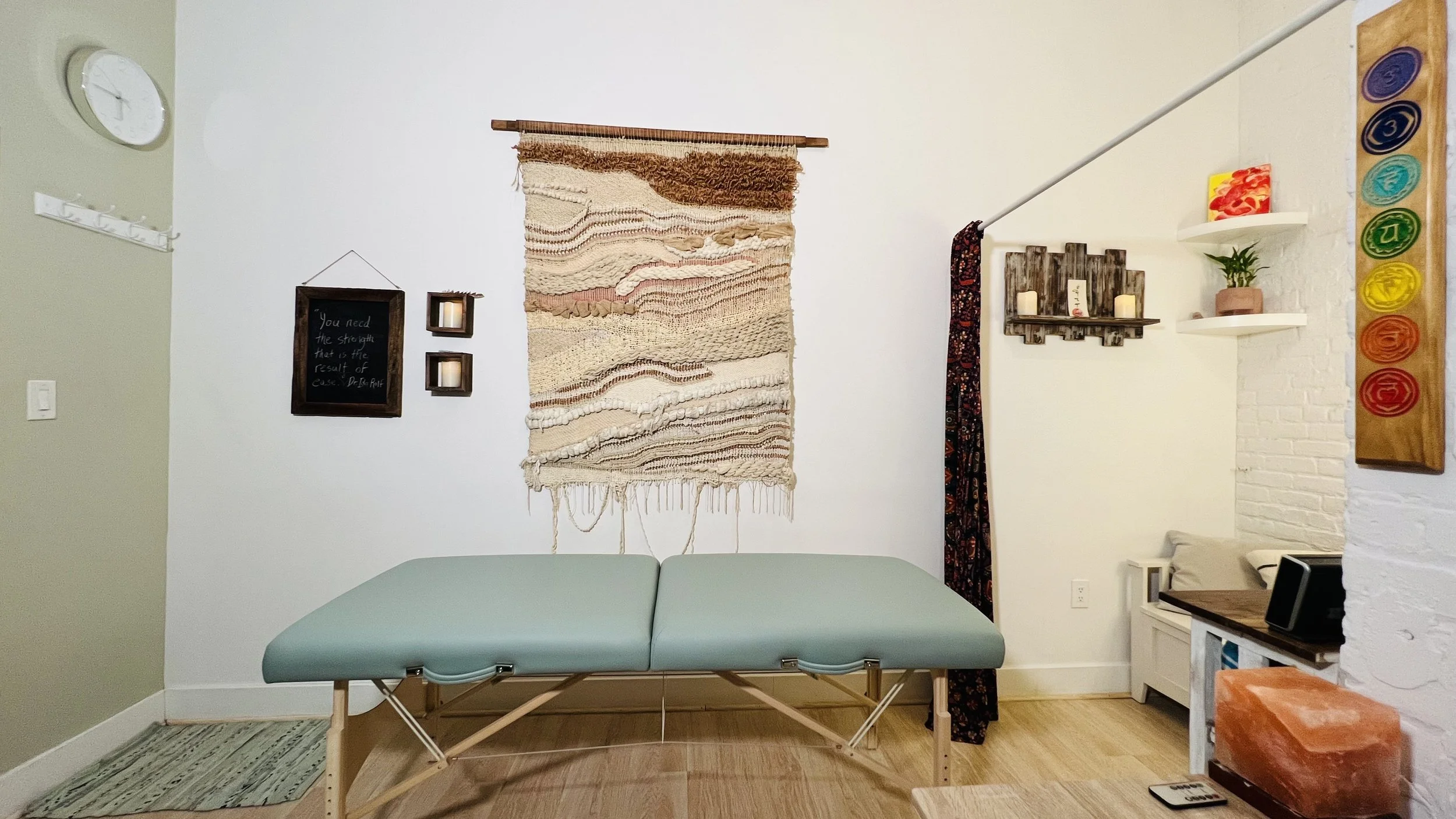 Desk, Bose Bluetooth speaker, massage table w/ warmer, yoga mats and props provided - please bring your own sheets
